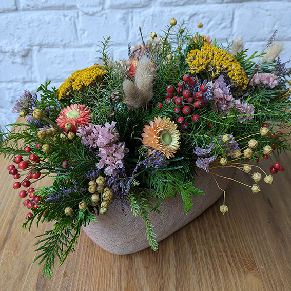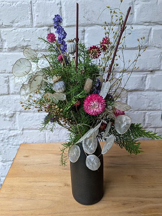 Van april tot de eerste vorst vind je bij Bloemspoor verse lokale ecologische bloemen, zorgvuldig geselecteerd bij bloementelers uit de regio en aangevuld met bloemen uit mijn bloementuin in Huizingen. In de wintermaanden, wanneer hier geen verse bloemen groeien, maak ik sfeervolle kransen en bloemstukken met bessen, bottels, seizoensgroen en droogbloemen. De bloemen worden in de zomer met zorg geoogst en gedroogd, zodat hun natuurlijke schoonheid behouden blijft.